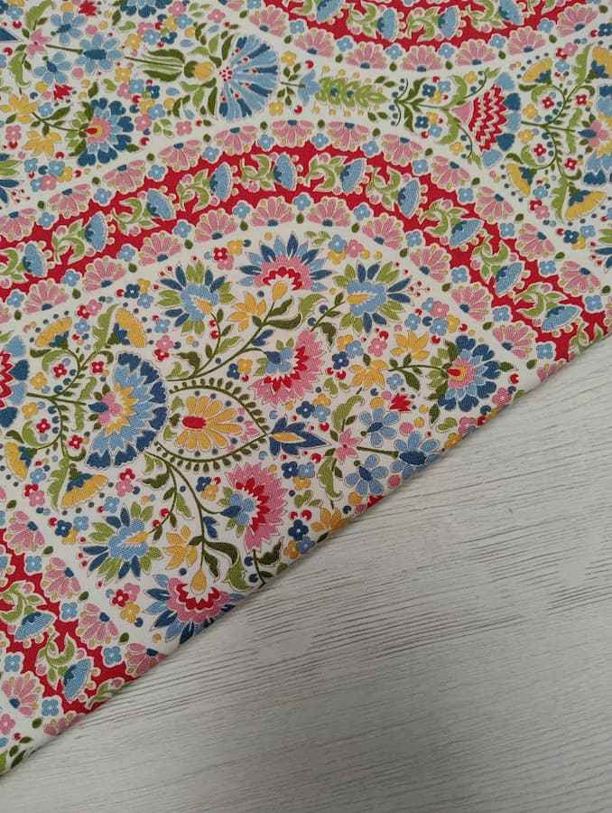 • Algodón americano de alta calidad con un ancho de 1,10m. Presenta un vibrante diseño floral de inspiración boho con detalles en rojo, azul y amarillo. Tejido suave, resistente y perfecto para labores de patchwork y confección creativa.